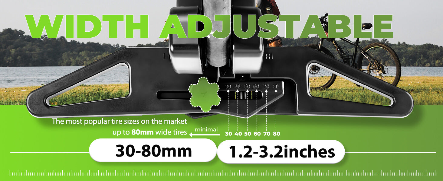 Its width adjusts from 30–80mm(Approx 1.2 inches - 3.2 inches) to fit most mountain and road bike wheels.